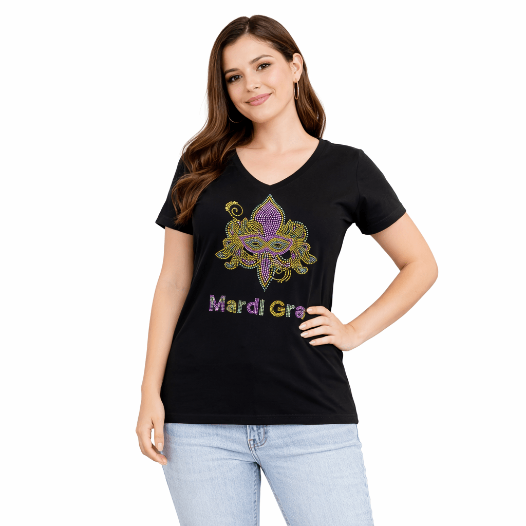 Mardi Gras Ladies Nola Rhinestone V-Neck - Black / Adult SM - Mardi Gras Apparel