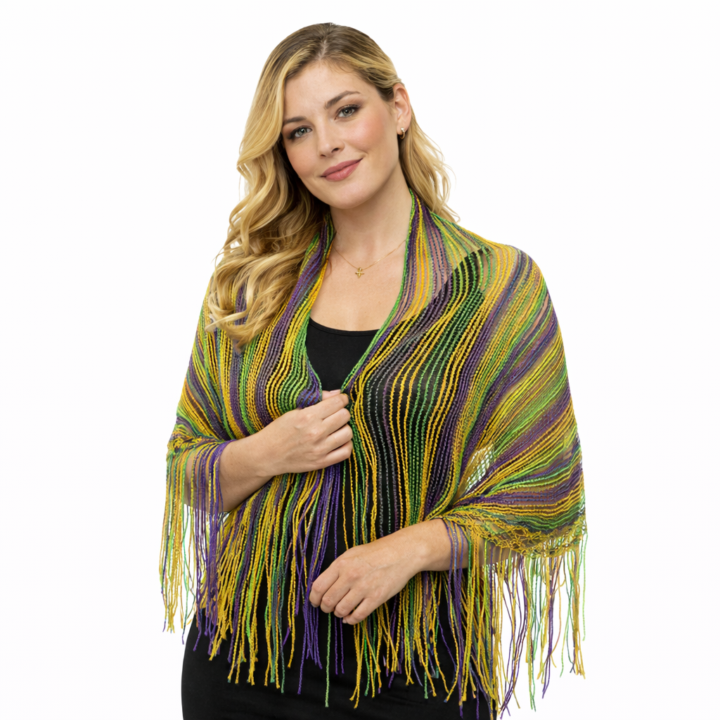 This beautiful wrap features a soft, lightweight knit design with colorful woven strands and flowing fringe tassels, creating a fun and eye-catching layered look. The signature Mardi Gras color combination symbolizes justice (purple), faith (green), and power (gold), making it the perfect accessory to celebrate the rich traditions of Mardi Gras.