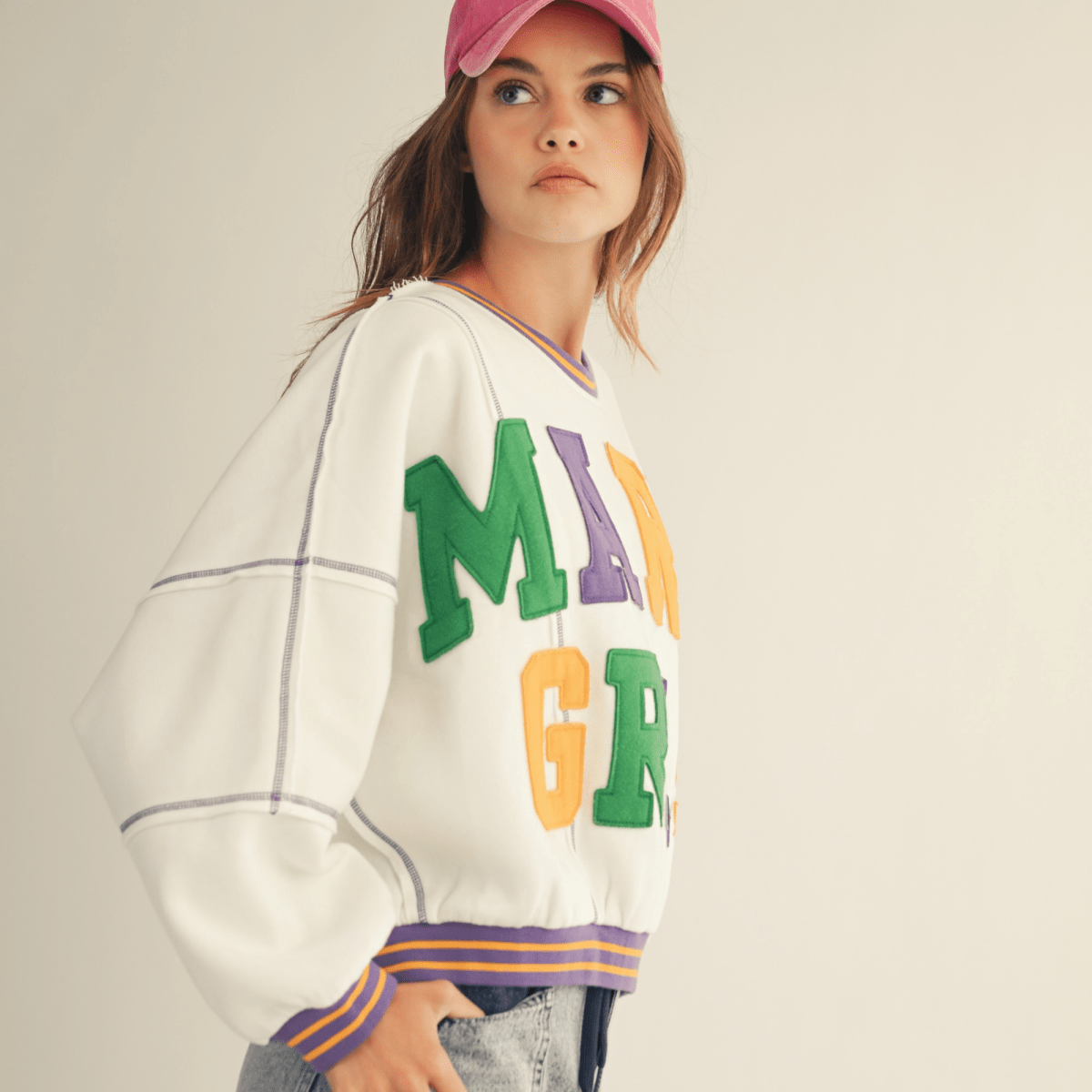 Celebrate Carnival season in effortless style with our Mardi Gras Loose Fit Sweatshirt Top, designed for comfort, personality, and festival-ready flair. This oversized sweatshirt features bold, varsity-style appliqué letters spelling MARDI GRAS in the iconic purple, green, and gold color palette instantly capturing the spirit of New Orleans. Perfect for parades, balcony parties, game days, and everyday festive wear, this top delivers both cozy warmth and standout style.