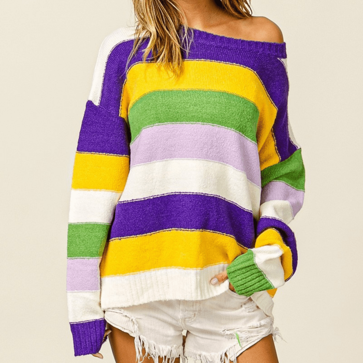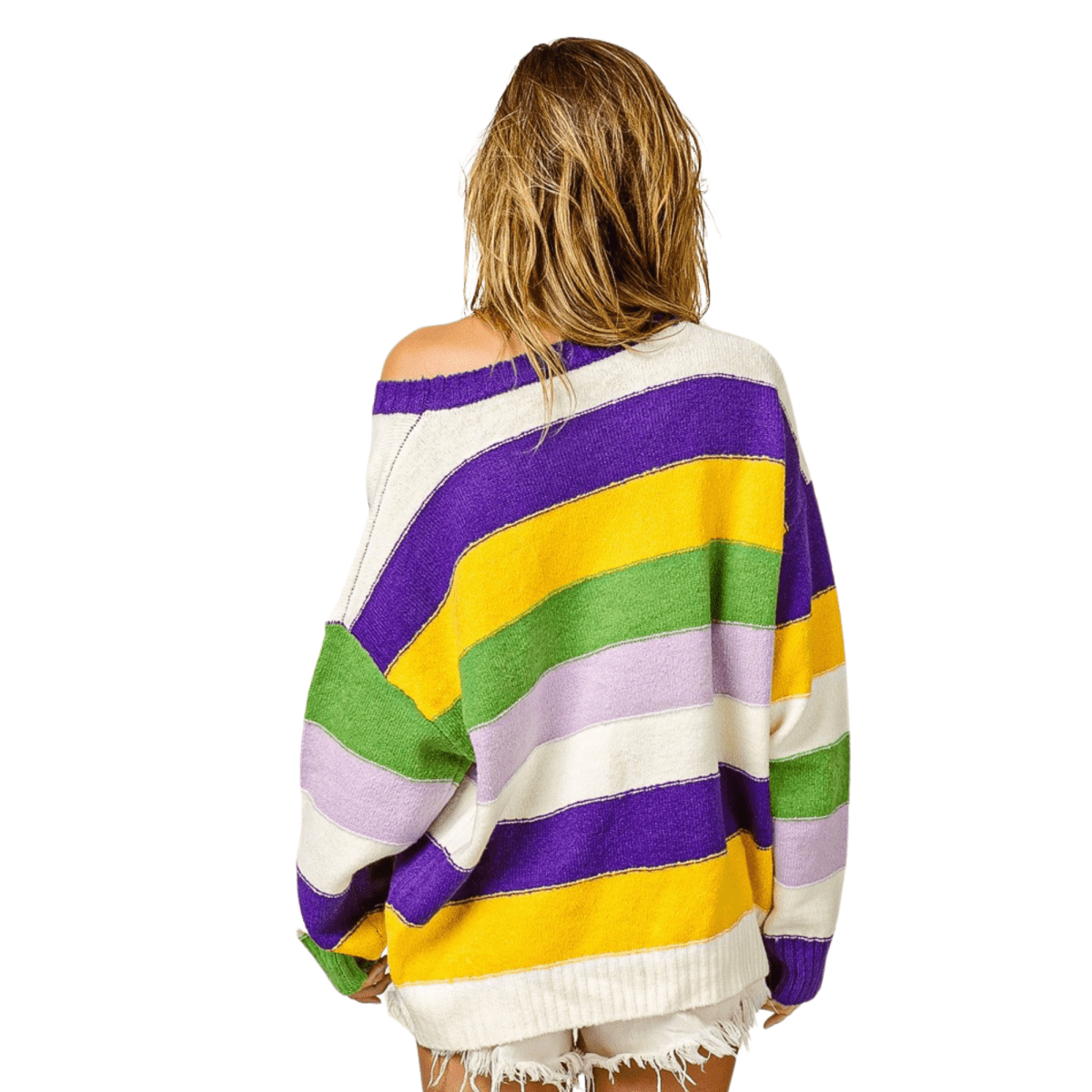 Whether you're celebrating with friends or showing your Carnival pride year-round, this multi-color stripe sweater is a must-have wardrobe essential. Bright, comfortable, and unmistakably Mardi Gras it's the perfect way to shine all season long.