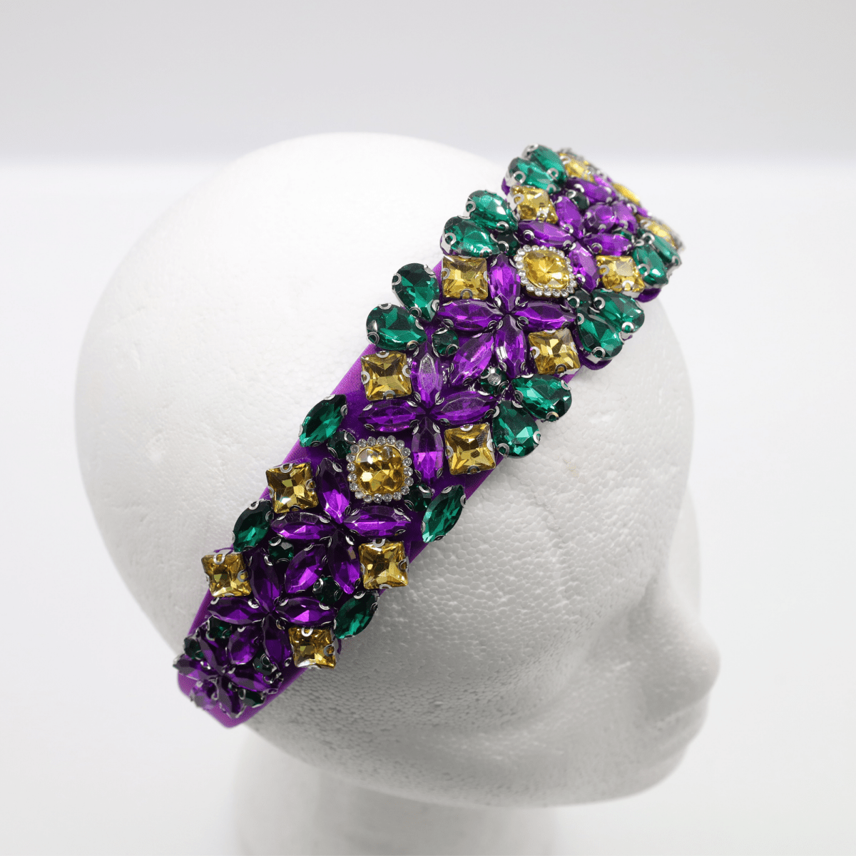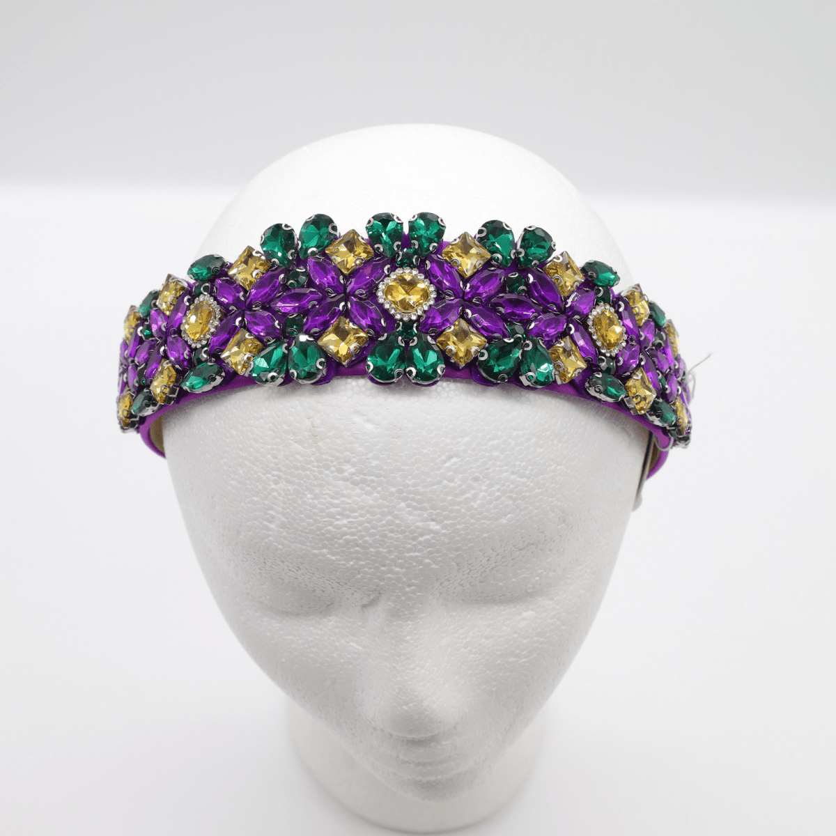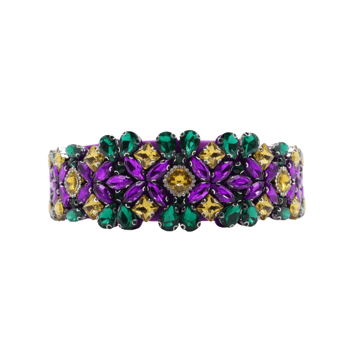 Turn heads this Carnival season with our Mardi Gras Purple Floral Rhinestone Headband for Women, a dazzling accessory that embodies the vibrant energy of New Orleans celebrations. This stunning headband features rich purple fabric adorned with intricate floral rhinestone clusters in green and gold the traditional Mardi Gras colors that symbolize justice, faith, and power. Each jewel sparkles brilliantly, catching the light as you dance, parade, or party through the festivities. The padded base ensures a secure, comfortable fit, making it ideal for all-day wear. Whether you’re dressing up for a Mardi Gras parade, costume ball, or simply adding festive flair to your outfit, this headband combines elegance and fun in perfect balance. Lightweight yet durable, it’s a must-have for any Mardi Gras queen ready to shine in style. Pair it with coordinating jewelry or a masquerade mask for a truly regal look!