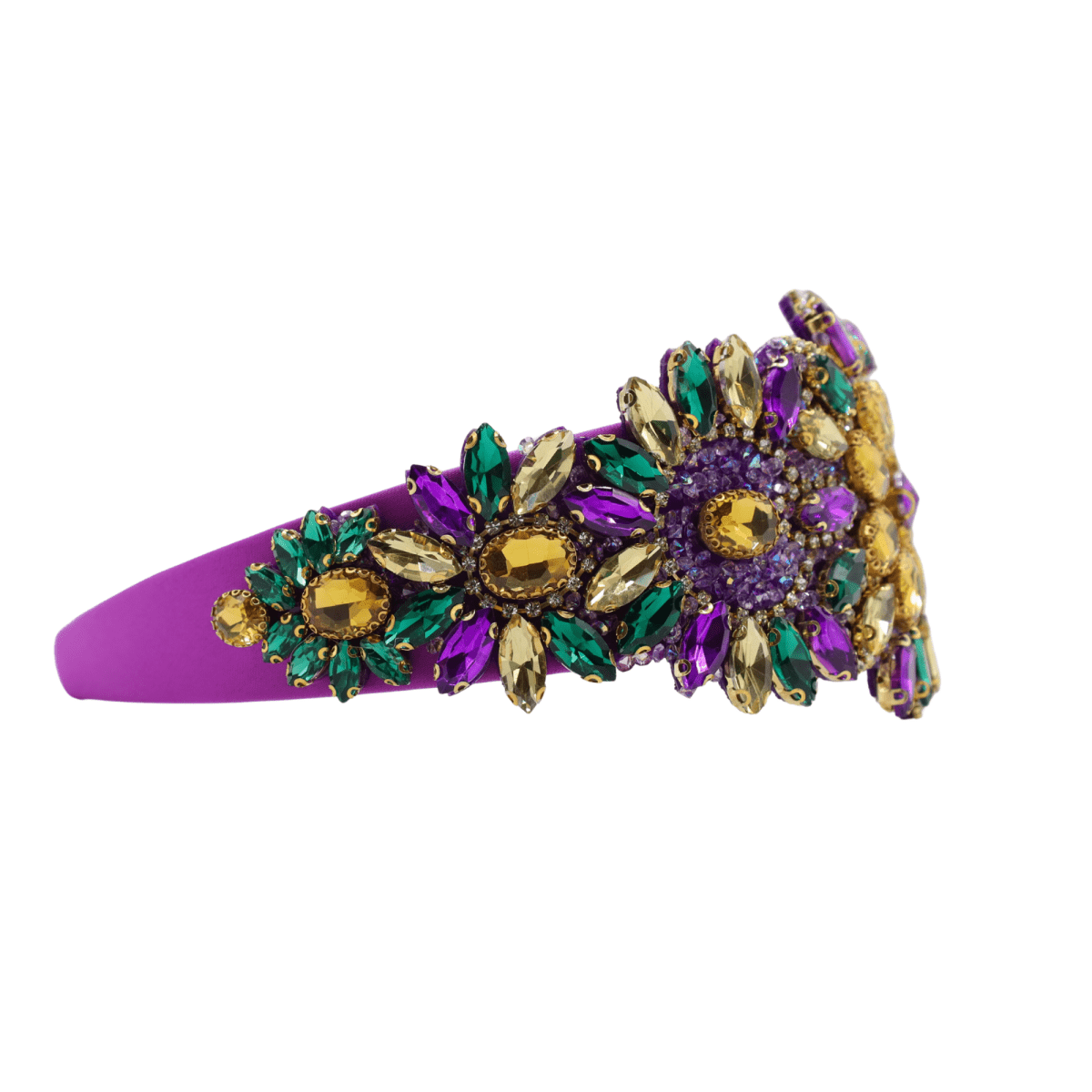Step into Mardi Gras season with elegance and sparkle wearing our Mardi Gras Purple Jeweled Rhinestone Headband for Women. This luxurious accessory features radiant purple fabric encrusted with gold, green, and amethyst rhinestones arranged in stunning floral patterns. Each jewel captures the essence of Mardi Gras purple for justice, green for faith, and gold for power blending tradition with modern style. The intricate craftsmanship and shimmering design make this headband a show-stopping piece, perfect for parades, parties, and festive events. Lightweight yet sturdy, it offers a comfortable fit that lasts all day while keeping your hair beautifully styled. Whether you’re celebrating Fat Tuesday, attending a masquerade ball, or simply embracing the carnival spirit, this jeweled headband adds a royal touch to any look. Pair it with your favorite Mardi Gras jewelry and accessories for a truly radiant ensemble!