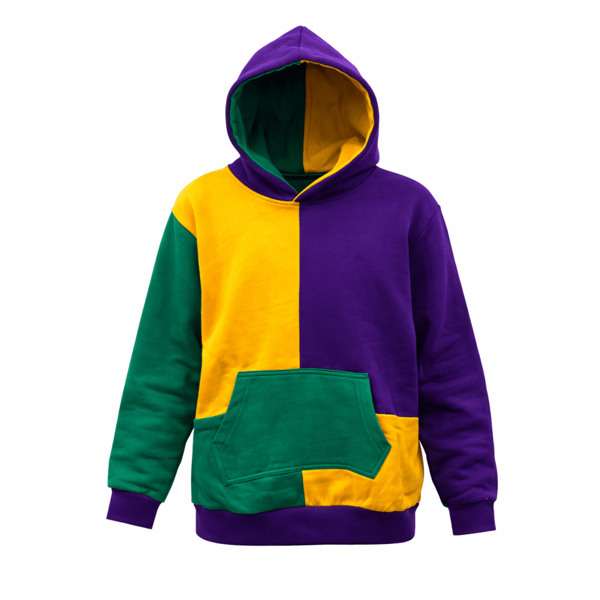 Celebrate Mardi Gras in bold style with this Youth Mardi Gras Color Block Pullover Hoodie, designed to keep kids comfortable, warm, and festive all season long. Inspired by the iconic colors of New Orleans Mardi Gras, this hoodie features a striking purple, green, and gold color-block design that captures the energy of parade days, school spirit events, and family celebrations.