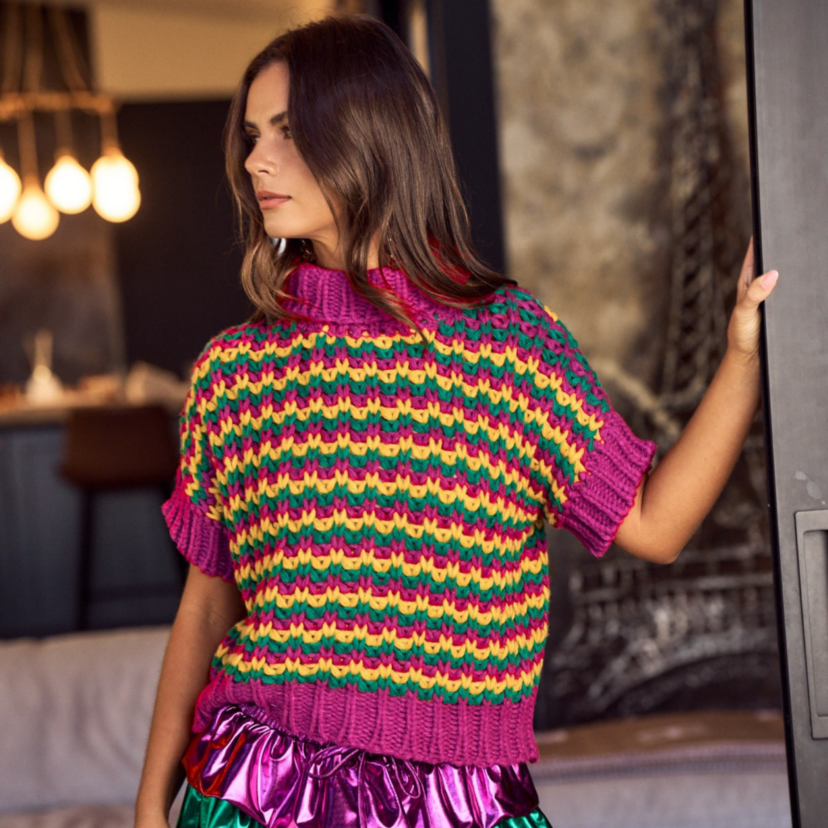 This sweater pairs effortlessly with skirts, shorts, leggings, or jeans, making it a versatile piece you’ll reach for all season long. Whether you’re dancing at a parade, attending a Mardi Gras party, or styling a festive everyday look, this chunky knit sweater brings color, texture, and celebration together in one must-have piece.