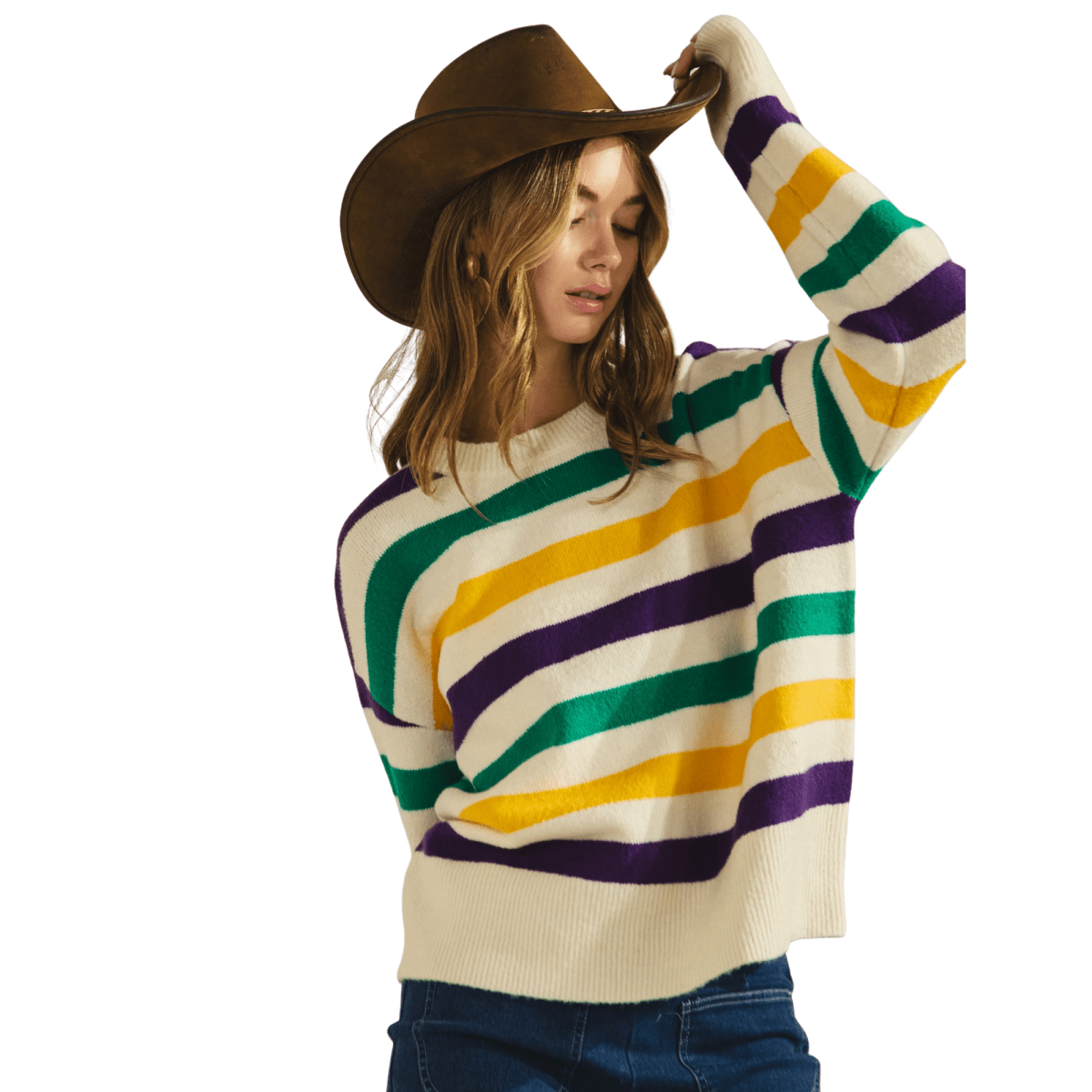 Made from a soft, cozy knit fabric, this sweater offers a comfortable fit that’s perfect for layering or wearing on its own. The ribbed neckline, cuffs, and hem provide structure while maintaining a relaxed silhouette that flatters all body types. Whether you’re heading to a Mardi Gras parade, brunch with friends, or a casual celebration, this striped sweater pairs effortlessly with jeans, skirts, or shorts for a festive yet laid-back outfit.