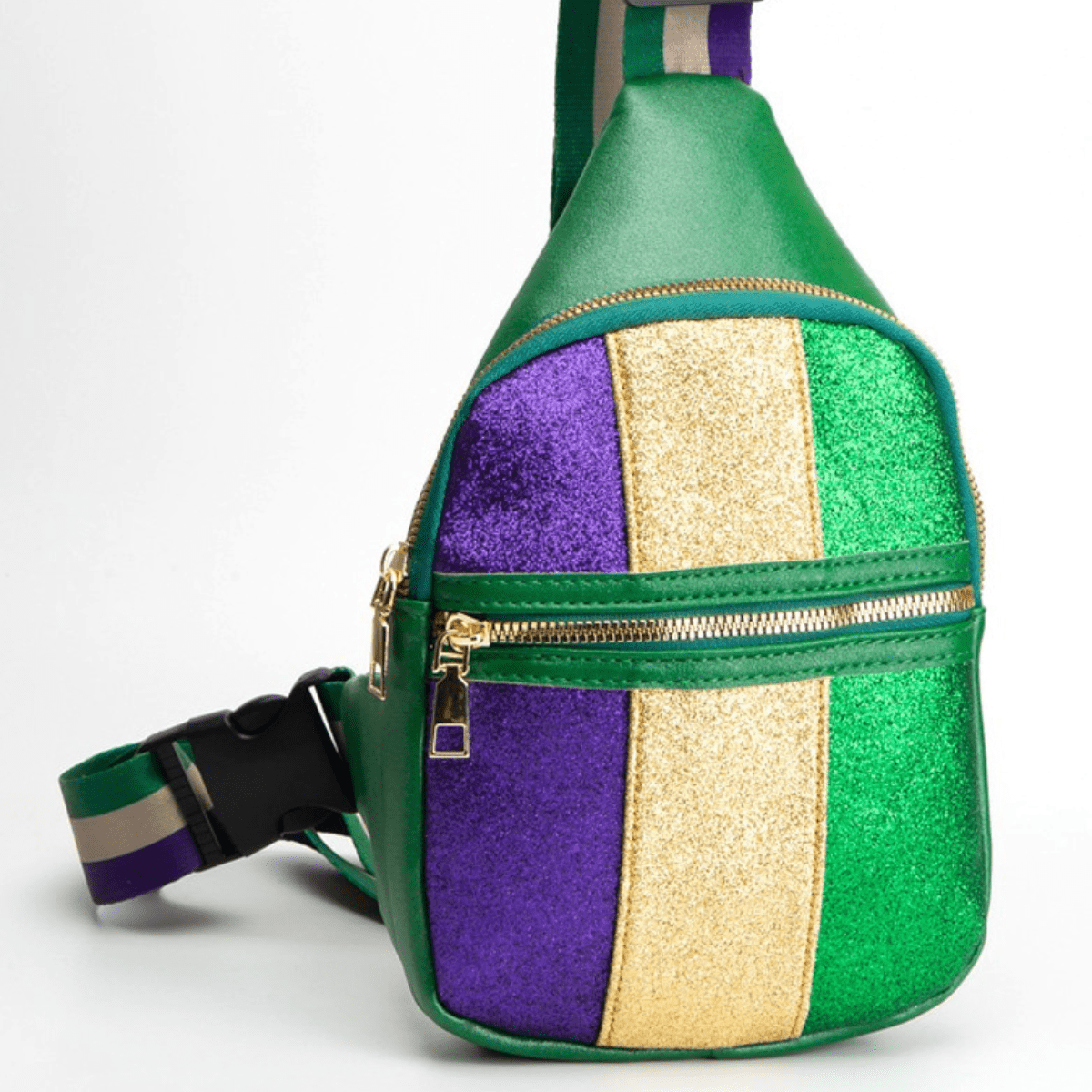 Celebrate Mardi Gras in hands-free style with this Green Sparkle Front Mardi Gras Sling Bag, designed to bring bold color and everyday convenience together. Featuring iconic purple, gold, and green glitter panels on the front, this compact sling bag is perfect for parades, festivals, concerts, or casual outings.