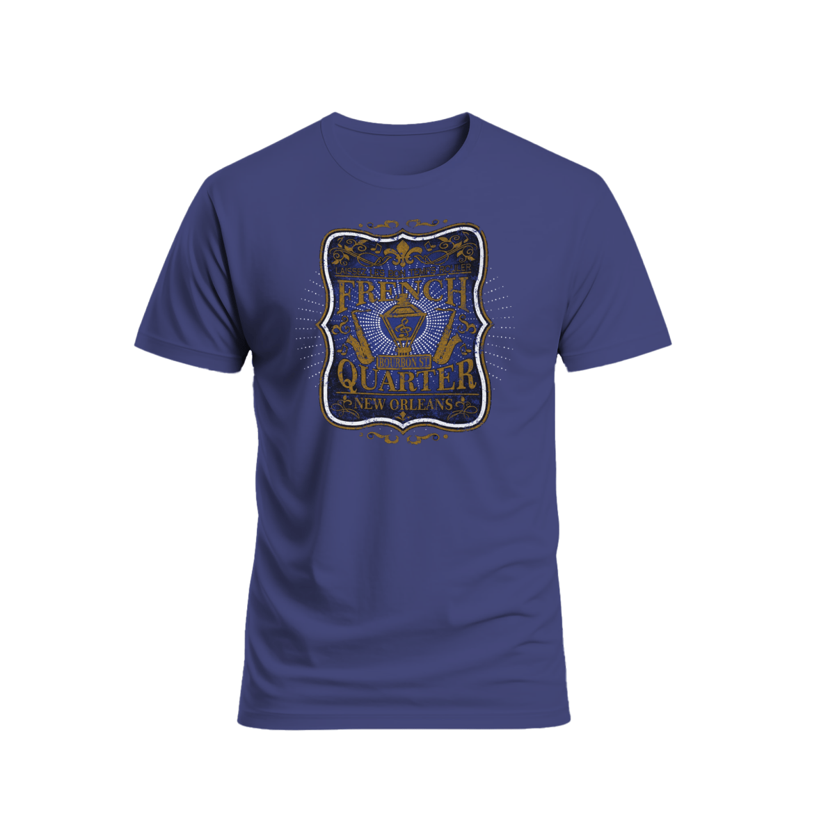 Celebrate the soul of New Orleans with this stunning French Quarter Bourbon Street T-Shirt, designed in a rich cobalt blue color that stands out with bold elegance. Featuring an ornate vintage-style emblem with gold and white detailing, this design highlights iconic NOLA elements street lanterns, trumpets, music notes, and the famous Bourbon Street sign.