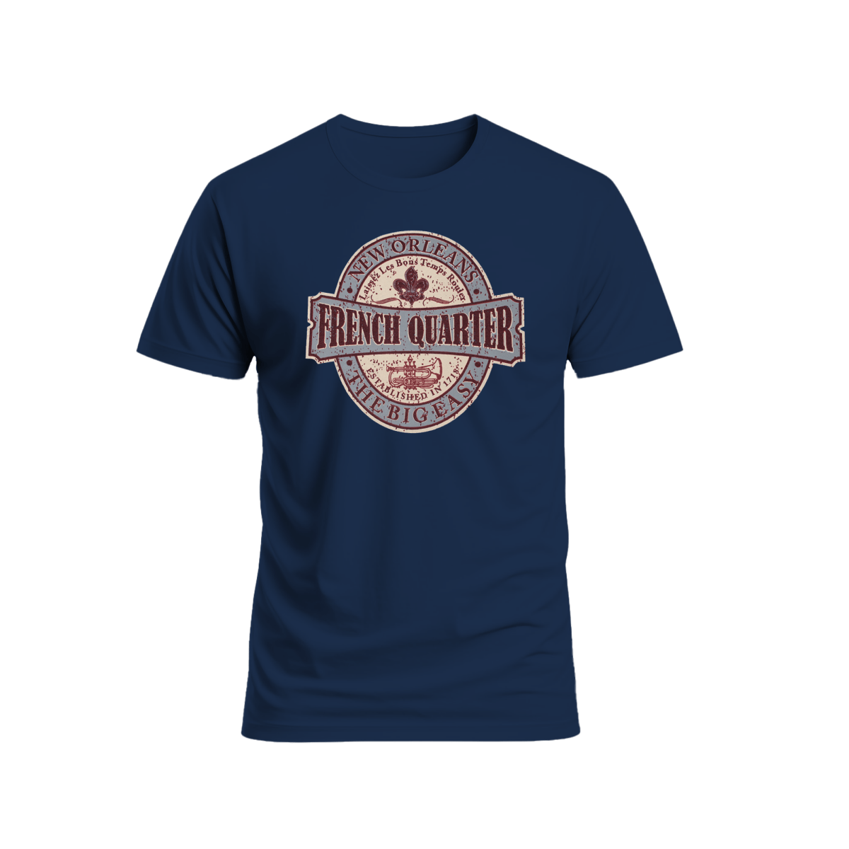 Celebrate the charm and history of New Orleans with this French Quarter Vintage Seal T-Shirt. Featuring a distressed circular emblem with “French Quarter,” “New Orleans,” and “The Big Easy,” this design captures the classic look of Louisiana’s most iconic neighborhood. Printed on a deep navy tee, the artwork includes a fleur-de-lis and weathered typography for an authentic vintage feel. Perfect for locals, tourists, and anyone who loves the unique culture of NOLA.