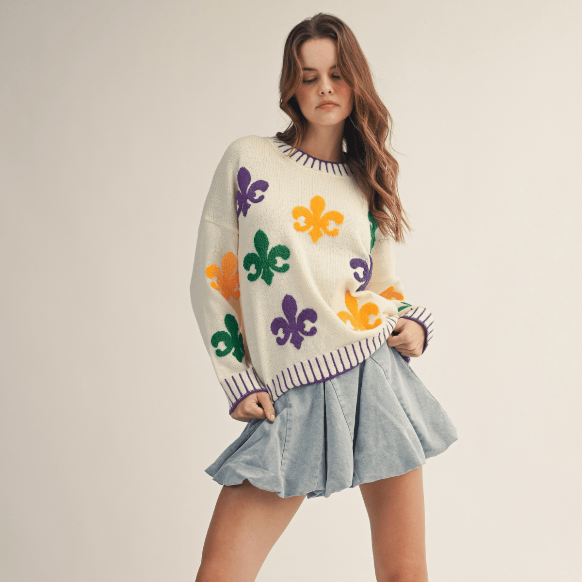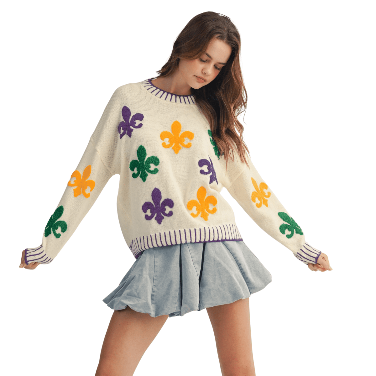 Celebrate timeless Mardi Gras tradition with a modern twist in our Mardi Fleur Heritage Knit Sweater. Designed to honor the iconic spirit of Mardi Gras, this sweater features bold fleur-de-lis motifs in classic purple, green, and gold, beautifully contrasted against a soft ivory knit background. Each fleur pattern represents heritage, celebration, and New Orleans pride, making this sweater a standout piece for carnival season and beyond.