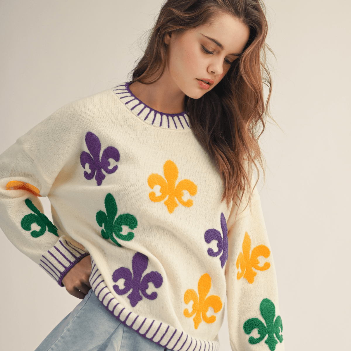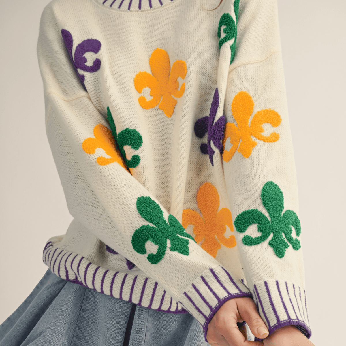 Whether you’re celebrating Fat Tuesday, attending a Mardi Gras party, or adding festive flair to your everyday wardrobe, the Mardi Fleur Heritage Knit Sweater delivers comfort, tradition, and unmistakable Mardi Gras style in one iconic piece.