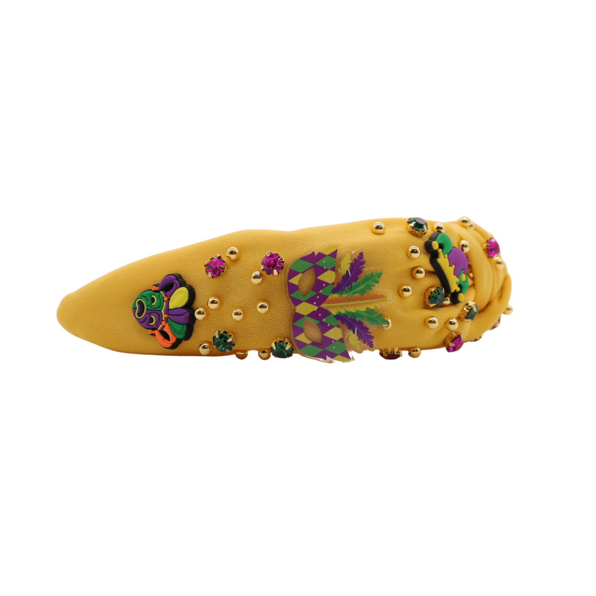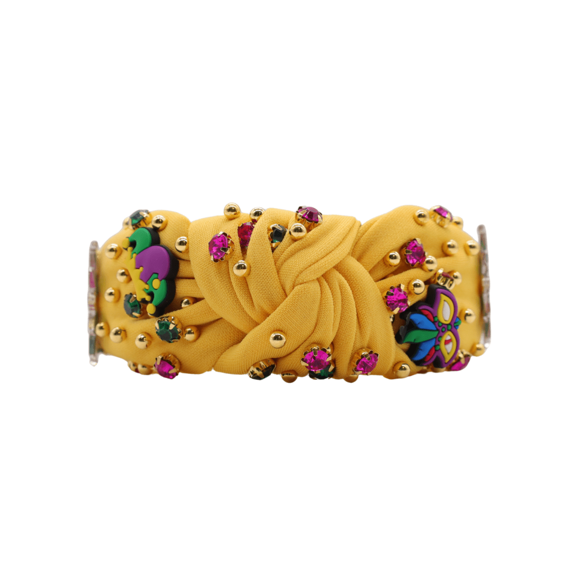 Shine bright this Carnival season with our Mardi Gras Beaded Mask Gold Rhinestone Headband for Women. This stunning accessory embodies the festive elegance of Mardi Gras with its radiant gold fabric adorned with sparkling rhinestones, metallic beads, and vibrant mask embellishments. Designed to capture attention, it brings together style, comfort, and celebration in one beautiful piece. The padded headband ensures a secure fit, making it perfect for long parade days or Mardi Gras parties. Each detail—from the gold beading to the colorful accents—adds a touch of New Orleans flair, making it the perfect finishing touch to your outfit. Whether you’re dressing up for Fat Tuesday or adding sparkle to your everyday look, this headband delivers festive charm with effortless style. Celebrate in gold and let the good times roll!