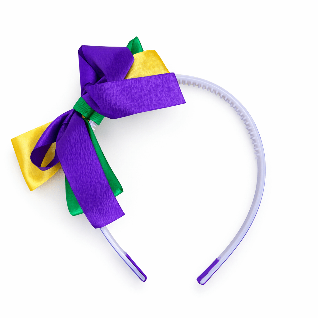 Designed for both comfort and style, this headband features a lightweight yet secure band that sits comfortably throughout the day, whether you’re dancing on Bourbon Street or enjoying a full day of Mardi Gras festivities. The layered bow adds playful volume and eye-catching detail, making it easy to pair with Mardi Gras dresses, graphic tees, sweaters, or casual parade outfits.