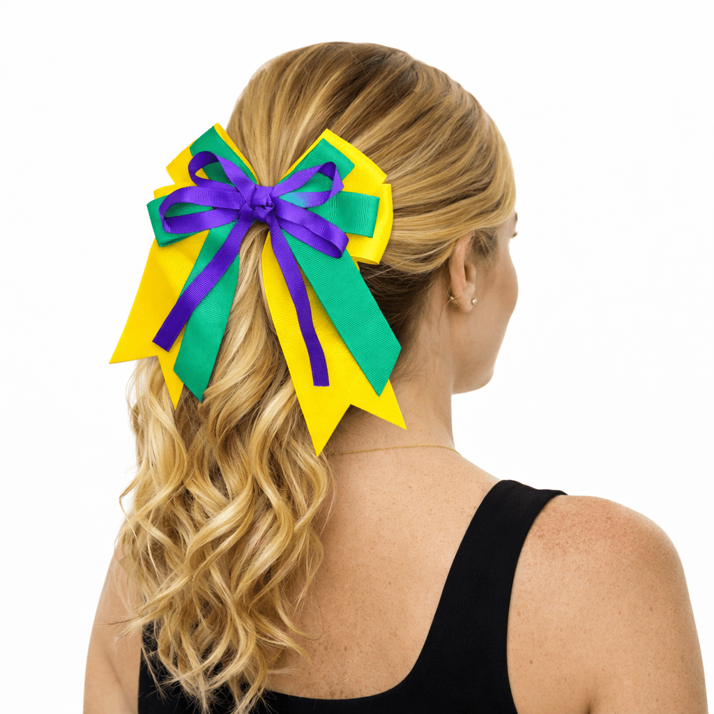 Celebrate Carnival season in style with this Mardi Gras Hair Bow with Ribbon Tails, featuring the iconic purple, green, and gold colors that define Fat Tuesday traditions. Designed with a classic layered bow and long flowing ribbon streamers, this festive hair accessory adds movement, color, and charm to any Mardi Gras outfit. Whether you’re heading to a parade, party, school celebration, or themed event, this hair bow delivers a fun and polished look that stands out.