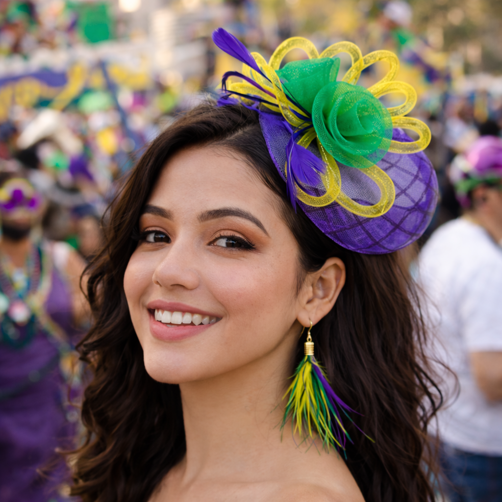 Lightweight and comfortable, this fascinator headband is easy to wear for hours without slipping or discomfort. The secure headband base keeps it in place while dancing, walking parade routes, or celebrating with friends. Whether paired with a Mardi Gras dress, sequin outfit, or casual festival look, this headband instantly elevates your style and adds a playful, eye-catching finish.