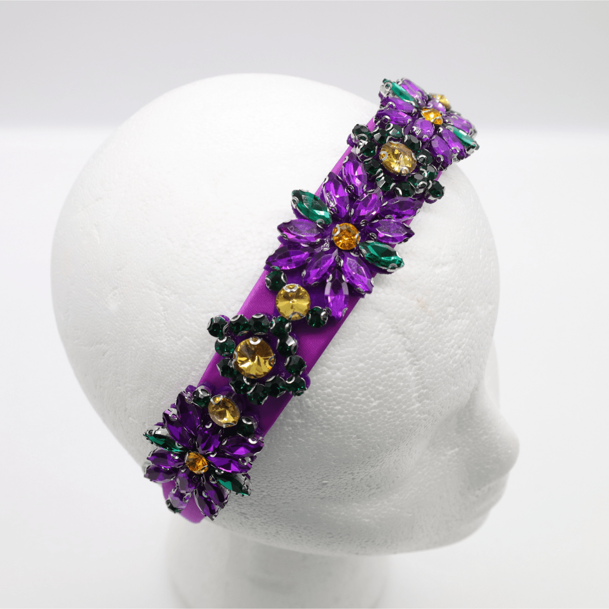 Turn heads this Carnival season with our Mardi Gras Purple Floral Rhinestone Headband for Women, a dazzling accessory that embodies the vibrant energy of New Orleans celebrations. This stunning headband features rich purple fabric adorned with intricate floral rhinestone clusters in green and gold the traditional Mardi Gras colors that symbolize justice, faith, and power. Each jewel sparkles brilliantly, catching the light as you dance, parade, or party through the festivities. The padded base ensures a secure, comfortable fit, making it ideal for all-day wear. Whether you’re dressing up for a Mardi Gras parade, costume ball, or simply adding festive flair to your outfit, this headband combines elegance and fun in perfect balance. Lightweight yet durable, it’s a must-have for any Mardi Gras queen ready to shine in style. Pair it with coordinating jewelry or a masquerade mask for a truly regal look!