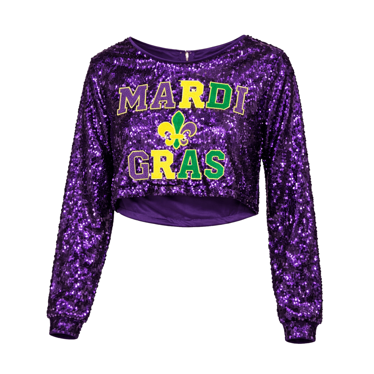 Shine bright all carnival season with this Mardi Gras Sequin Long Sleeve Crop Top, designed to bring bold sparkle and festive energy to any celebration. Featuring an all-over purple sequin finish, this eye-catching crop top is accented with vibrant “Mardi Gras” lettering and a classic fleur-de-lis emblem in traditional purple, green, and gold colors.