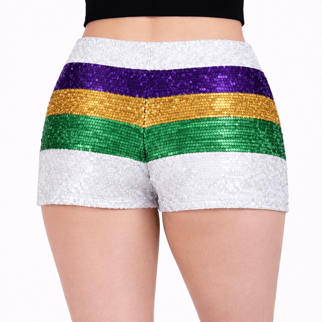 Step into the spotlight this Mardi Gras with our Mardi Gras Sequin Shorts, designed to bring bold sparkle and nonstop comfort to your celebration wardrobe. Featuring classic horizontal stripes in purple, gold, and green with bright white accents, these shorts instantly capture the festive spirit of Mardi Gras. The all-over sequin finish reflects light beautifully, making them a standout choice for parades, parties, and late-night festivities.