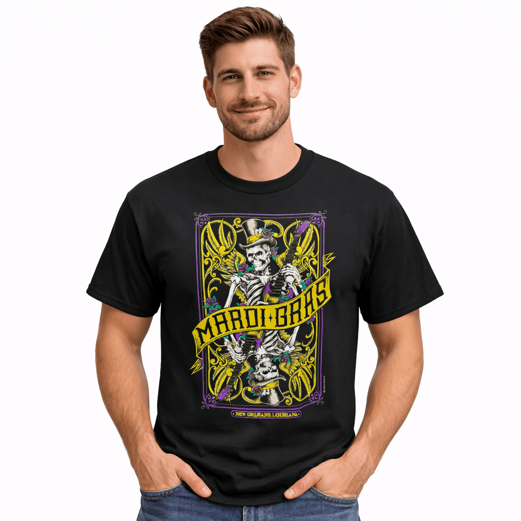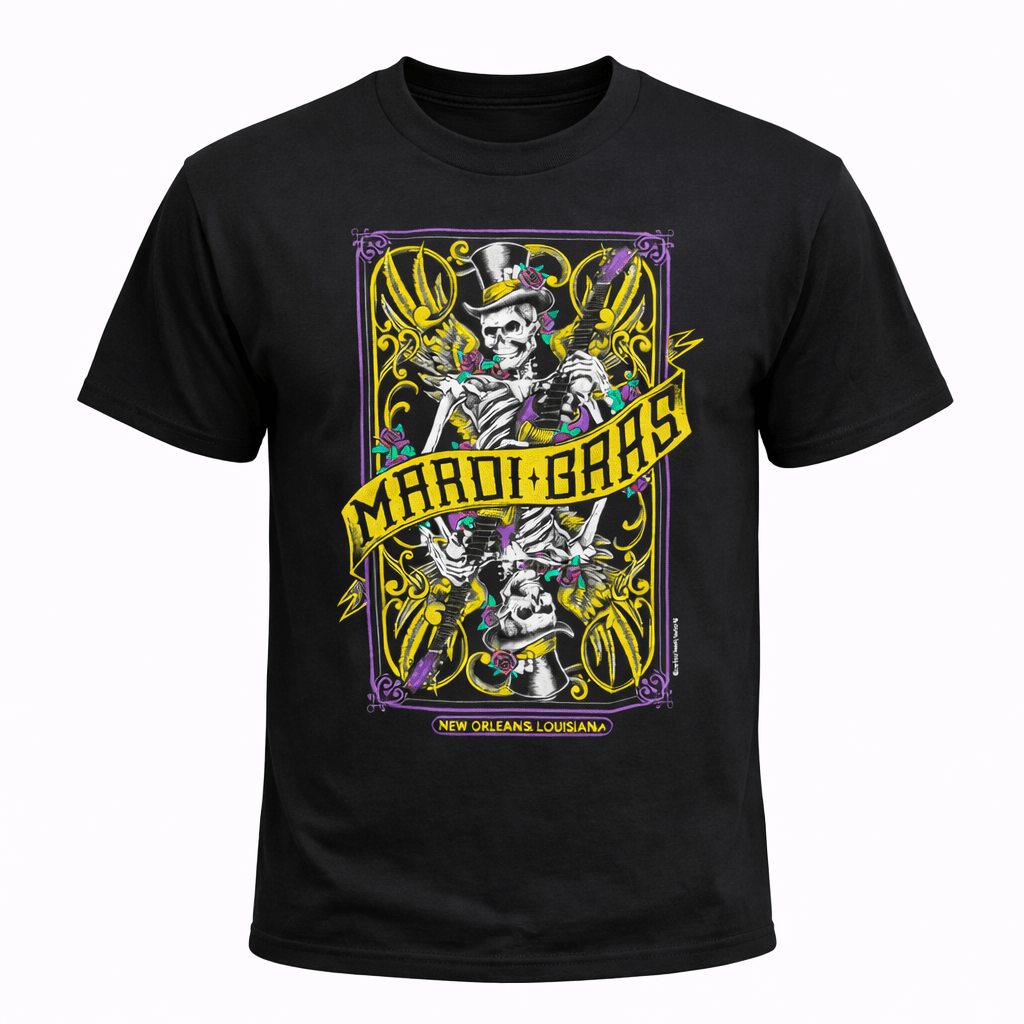 Turn heads this Carnival season with our Mardi Gras Skull Graphic T-Shirt, a bold and artistic take on traditional Mardi Gras style. Featuring a detailed skull illustration inspired by classic playing card artwork, this tee blends New Orleans culture, Carnival symbolism, and edgy street style into one unforgettable design. Accented with purple, green, and gold details and finished with “Mardi Gras – New Orleans, Louisiana” text, this shirt celebrates the spirit of the city in a unique and expressive way.
