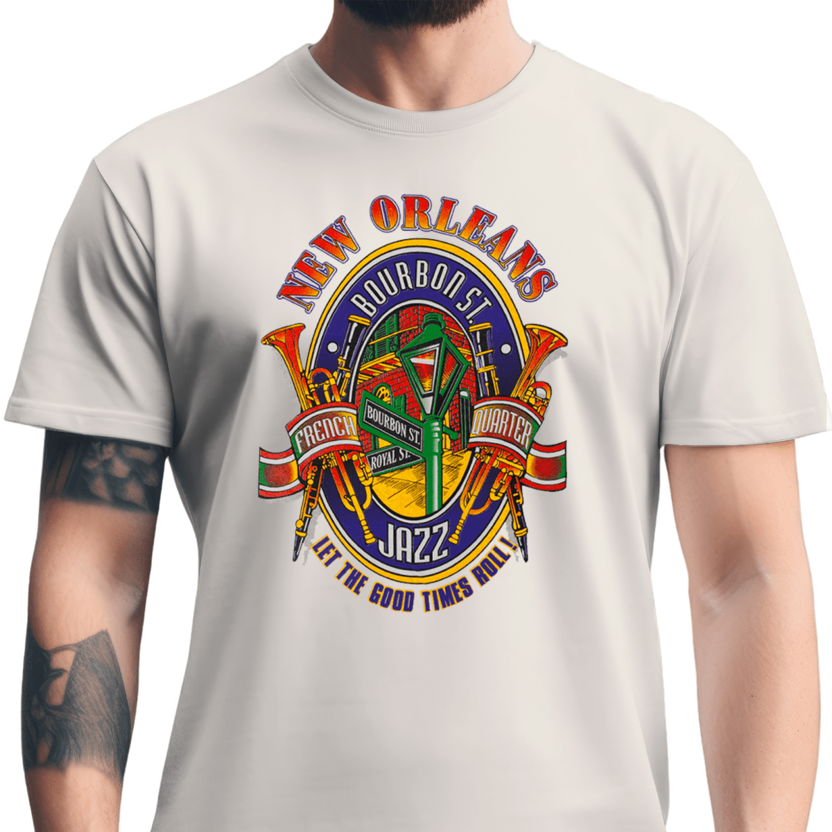 Celebrate the soul of New Orleans with this vibrant Bourbon Street Jazz T-Shirt in a clean Ice Gray color. Featuring a bold and colorful design of the iconic Bourbon St. and Royal St. signs, classic jazz instruments, and the famous motto “Let the Good Times Roll”, this tee perfectly captures the heartbeat of the French Quarter.