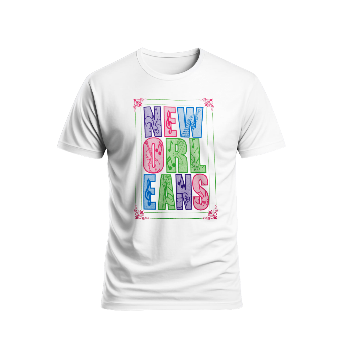 Celebrate the vibrant spirit of New Orleans with this colorful letter-art graphic T-shirt. Each bold block letter is uniquely illustrated with iconic symbols of the city musical notes, instruments, fleur-de-lis, and cultural elements creating a fun and artistic design that stands out in any crowd.