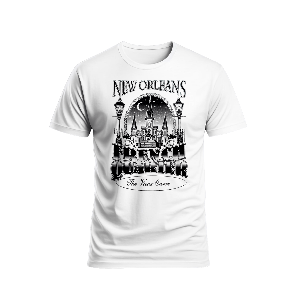Celebrate the magic and history of New Orleans with this bold French Quarter “The Vieux Carré” T-Shirt. Featuring a beautifully illustrated nighttime scene of St. Louis Cathedral, classic French Quarter street lamps, and a vintage black-and-white design, this shirt captures the charm and mystery of the Crescent City.