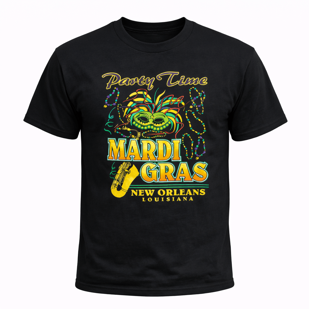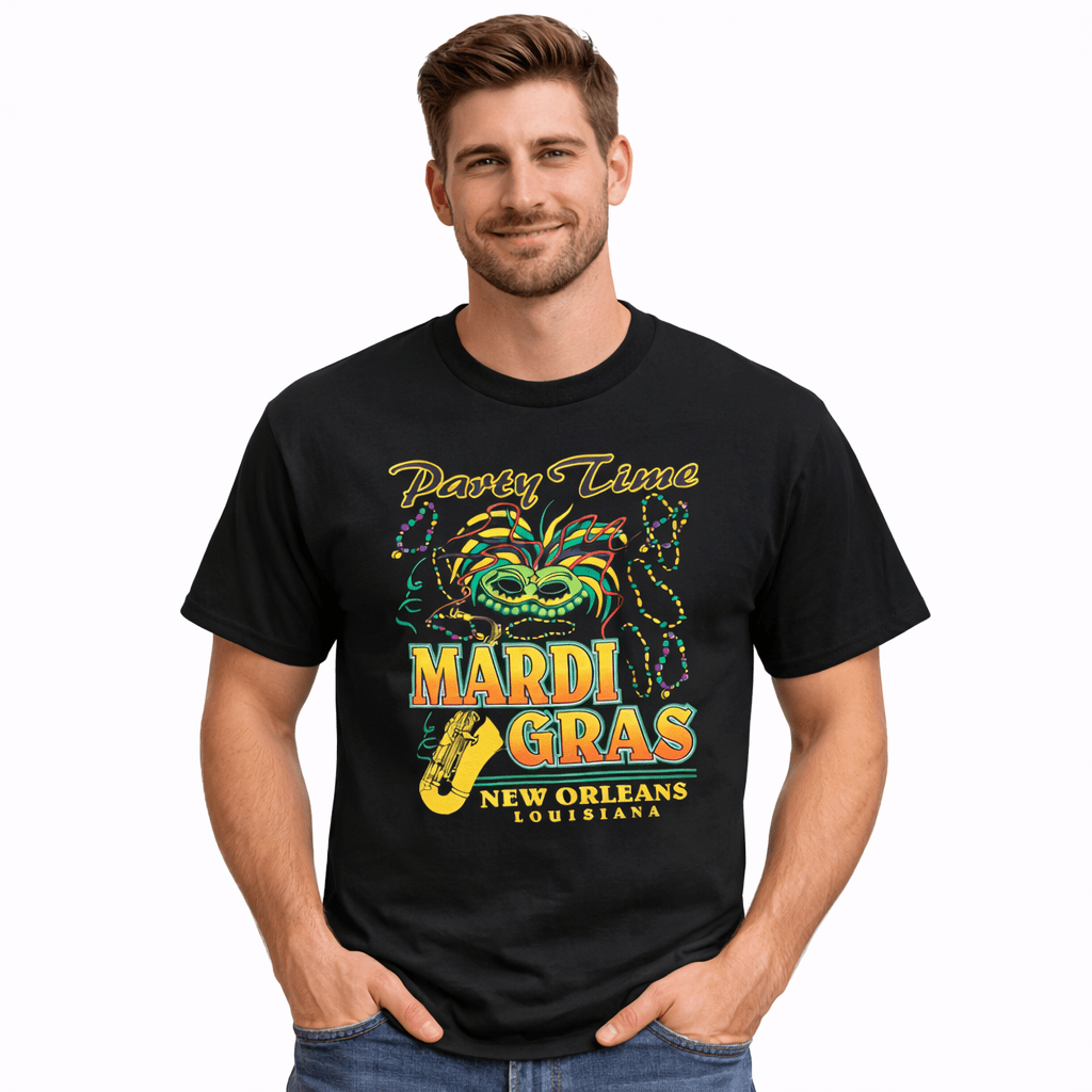 Get ready to celebrate in true New Orleans fashion with our Party Time Mardi Gras Graphic T-Shirt, designed for those who bring the energy wherever Carnival takes them. This festive tee features a vibrant Mardi Gras mask graphic paired with colorful beads, musical elements, and bold lettering that reads “Party Time Mardi Gras – New Orleans, Louisiana.” It perfectly captures the rhythm, fun, and excitement of Mardi Gras season.