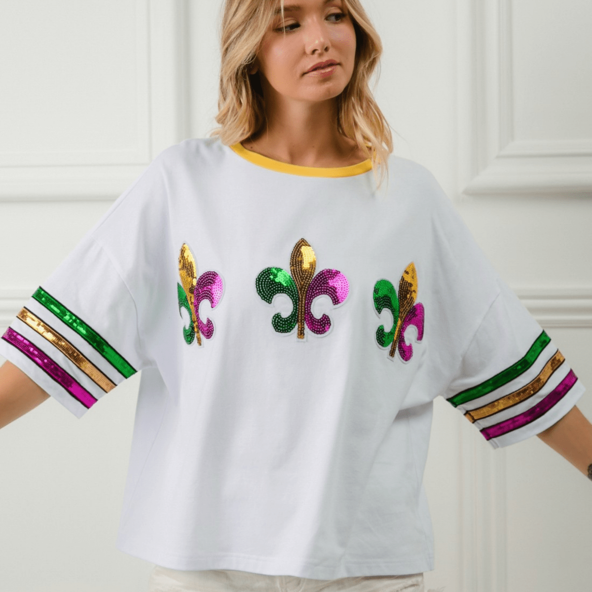 Whether you're coordinating a group outfit or looking for a standout top for Fat Tuesday, this sequin-embellished piece is the perfect blend of comfort, color, and Mardi Gras magic.