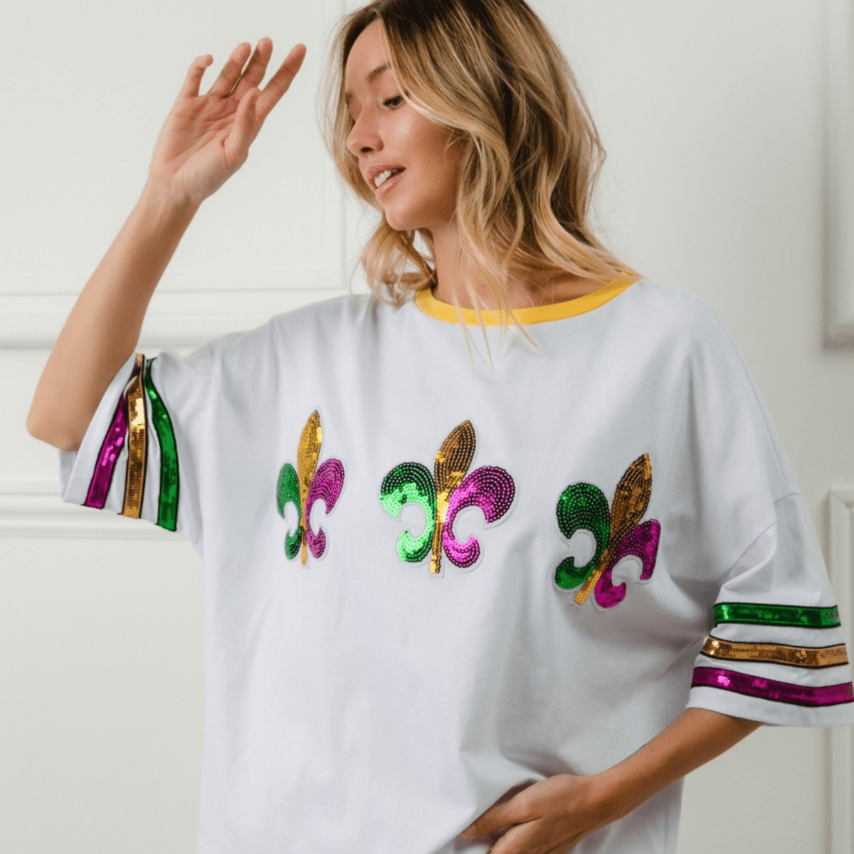 Show off your Mardi Gras spirit in bold, sparkling style with the Sequin Fleur De Lis Patches Mardi Gras Top. Designed for parade lovers and festive fashion fans, this top features stunning sequin fleur-de-lis patches across the front—each shimmering in traditional Mardi Gras colors of purple, green, and gold. The oversized fit gives it a relaxed, breezy look, making it perfect for all-day comfort while celebrating at parades, parties, or Carnival weekend events.