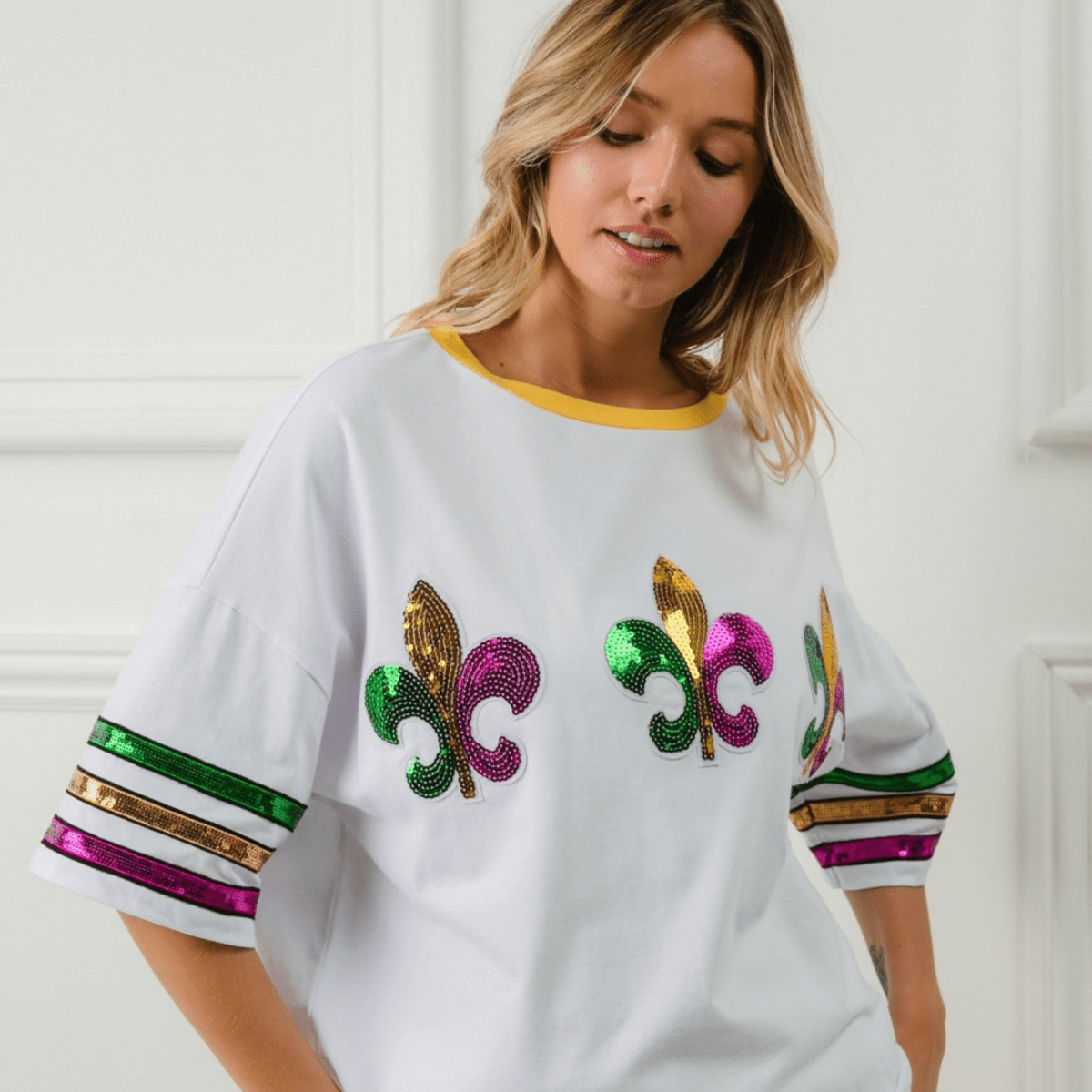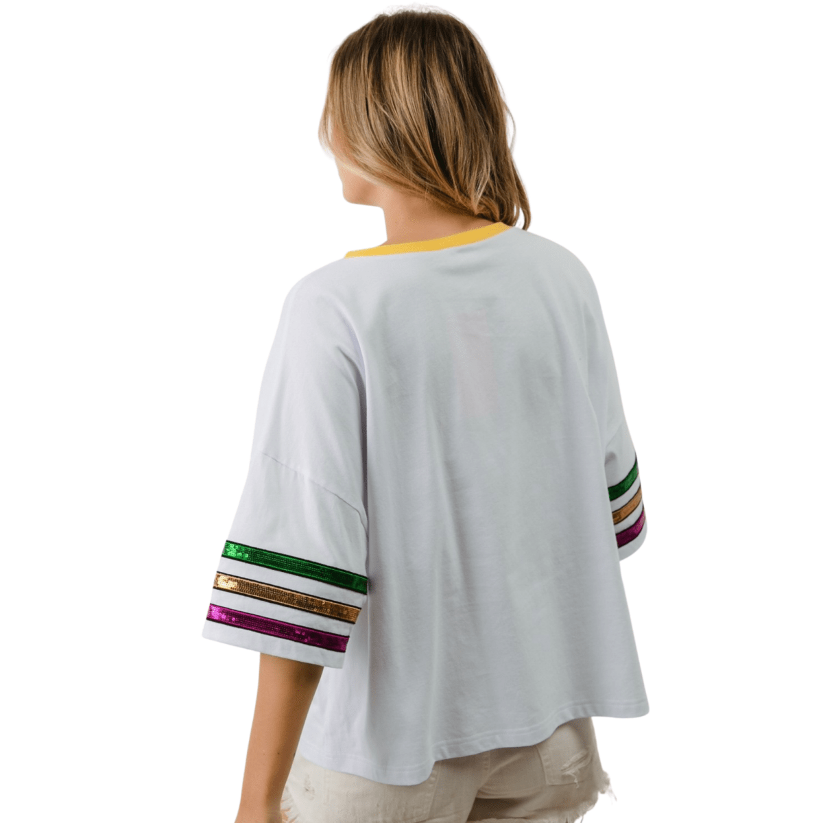 The sleeves bring even more flair with metallic sequin stripe detailing that adds movement, shine, and a sporty finish. Soft, breathable fabric ensures comfort whether you're dancing, walking the parade route, or enjoying a night out in New Orleans. Its flattering, loose silhouette pairs perfectly with shorts, jeans, or sequin bottoms.