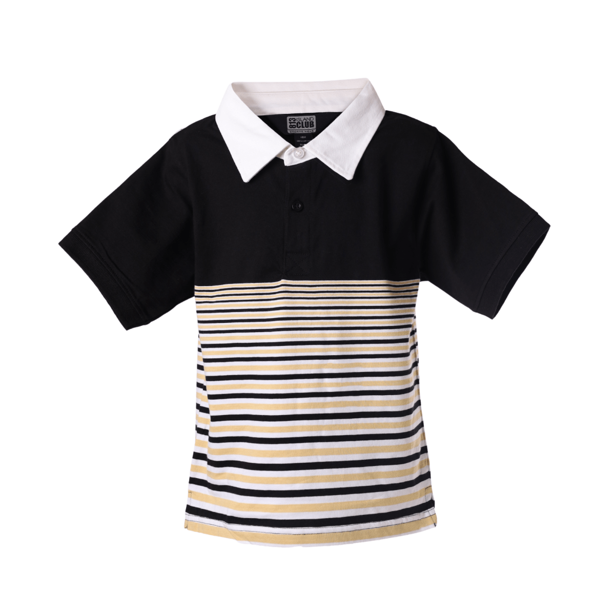 Keep young trendsetters looking sharp with the Youth Black & Gold Striped Panel Polo Shirt from our Black & Gold Collection. This short sleeve polo features a sleek black upper with a crisp white collar and bold black-and-gold horizontal stripes across the lower half. Made from a soft, breathable cotton blend, it offers all-day comfort while maintaining a polished look. Perfect for school, casual outings, or game day spirit, this polo is a versatile addition to any youth wardrobe.