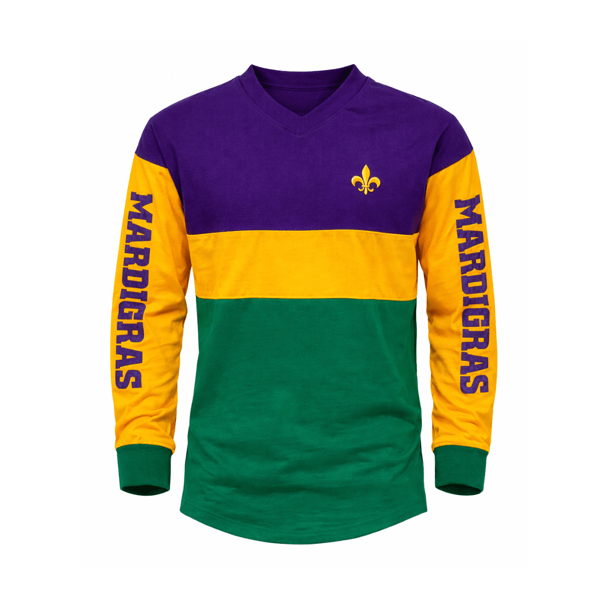 The top showcases a rich purple upper panel, a vibrant gold center stripe, and a deep green lower section, reflecting the iconic Mardi Gras color palette. Matching raglan-style sleeves add a sporty touch, while “Mardi Gras” lettering printed along the sleeves and a subtle fleur-de-lis emblem on the chest complete the festive look. The unisex fit ensures easy wear for both boys and girls, allowing for comfortable movement during all-day celebrations.